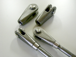 付属の部品(フォークエンド、ターンバックル、ピンなど)の形状は鉄製のGブレースと同様です。鉄製のGブレースと同様、付属部品を在庫しておりますので(クロスターンバックルは受注生産です。)ステンレスといえどもかなりコストを抑えて製品をご提供出来ます。また既製品のみならずオリジナルデザイン部品も製作可能です。